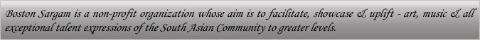 Boston Sargam is cultural organization, in partnership with people like you, with an objective to facilitate, showcase & uplift art, dance, music, comedy & all exceptional talent expressions of the South Asian Community to greater levels.
